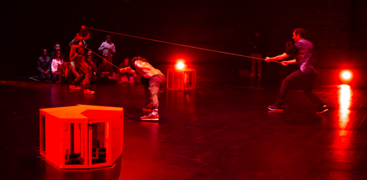 En las obras anteriores de AzkonaToloza se ha ido consolidado un método de hacer que va componiendo espacio y escenografía en el transcurrir de la obra, de sus coreografías, textos, luces, música y objetos. En Nuestro refugio galáctico esa maquinaria escénica es coprotagonista de la obra, junto con lxs espectadorxs que la construyen juntxs. ¿Cómo ha sido este trabajo coreográfico-espacial?